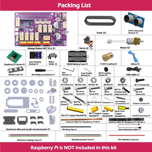 Le kit **Adeept RaspTank Metal Smart Robot Car** est une solution complète pour apprendre la robotique, programmer des déplacements intelligents, intégrer des capteurs et développer des applications en OpenCV ou ROS. Compatible avec plusieurs versions de Raspberry Pi (4B, 3B, 3B+ et souvent Raspberry Pi 5 avec adaptateur), ce robot sur chenilles combine robustesse mécanique et nombreuses possibilités d’extension.