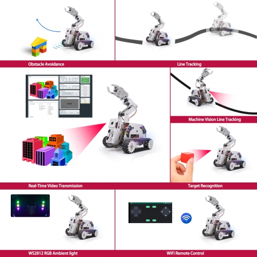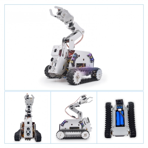 La plateforme se compose d’un châssis en métal durable, de moteurs puissants adaptés à des déplacements fluides, et d’un bras robotique à 4 degrés de liberté (4-DOF) pour saisir, soulever et manipuler de petits objets. Grâce à la compatibilité avec Raspberry Pi, il peut être programmé en Python, C++ ou d’autres langages populaires utilisés en robotique éducative et professionnelle.