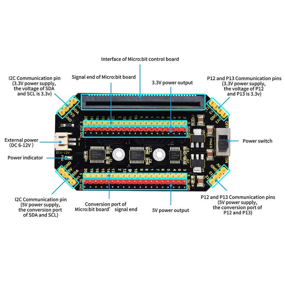 La carte d’extension IO rend l’utilisation du micro:bit beaucoup plus simple. Elle expose clairement les broches d’entrée et de sortie. Ainsi, vous pouvez connecter vos composants sans difficulté.