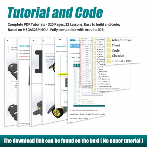 • Construction Simplifiée : Grâce à notre tutoriel détaillé et facile à suivre (20 leçons), l’assemblage et la programmation de votre voiture intelligente se feront de manière intuitive, même si vous débutez.